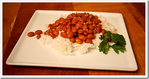 Ingredients: Pinto Beans, tomato paste, water, vinegar, white rice, sazon seasoning (a general Mexican seasoning mix that includes cilantro, achiote, garlic, salt), garlic and olive oil.