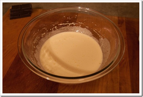While brownies cool make the ganache. Add 1/4 c. of heavy cream and 1/2 c. of chocolate chips. Microwave for 1 minute.
